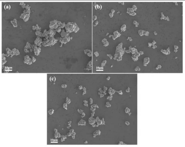 Mg2Ni合金顆粒呈現(xiàn)凹凸不平的形狀和粗糙的表面織構(gòu)。圖2(a)表明顆粒團(tuán)聚和融合明顯,粒徑分布不均勻,超過(guò)10μm的顆粒普遍存在。這主要是由于球磨過(guò)程中韌性組分、鎂元素、分層和粘結(jié)造成的。球磨機(jī)的頻繁沖擊導(dǎo)致材料不斷破碎,少量的MWCNTs不能提供足夠的潤(rùn)滑,導(dǎo)致顆粒尺寸變大。隨著MWCNTs用量的增加,其提供潤(rùn)滑的作用更加明顯。粉末顆粒尺寸減小,團(tuán)聚和焊合現(xiàn)象的發(fā)生減少。這表明摻入MWCNTs可以有效地減少團(tuán)聚和融合的發(fā)生。