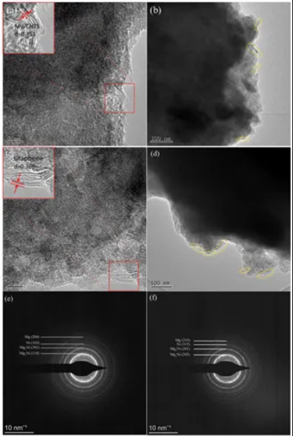 ①在球磨過(guò)程中,復(fù)合材料中石墨烯和MWCNTs含量的增加放大了其潤(rùn)滑和助磨作用。這導(dǎo)致了晶粒尺寸的重新調(diào)整,并減少了團(tuán)聚和焊接的情況。石墨烯和MWCNTs的引入在Mg2Ni合金顆粒的外部產(chǎn)生了表面缺陷,并為氫的吸收和解吸建立了通道,從而增強(qiáng)了儲(chǔ)氫動(dòng)力學(xué)的動(dòng)態(tài)行為。