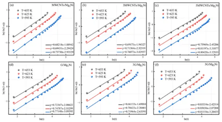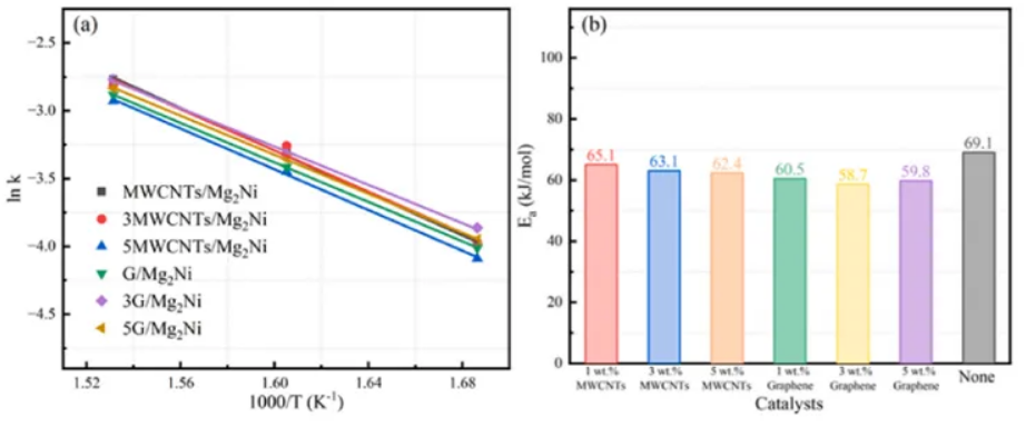 MWCNTs和石墨烯的結(jié)合有效地降低了Mg2Ni合金放氫反應(yīng)所需的活化能,從而提高了放氫動(dòng)力學(xué)效率。特別值得注意的是,在3wt%石墨烯復(fù)合材料中,激活能最低為58.7kJ/mol,與Mg2Ni合金相比降低了約10kJ/mol。這突出了合金放氫動(dòng)力學(xué)最有效的增強(qiáng)。